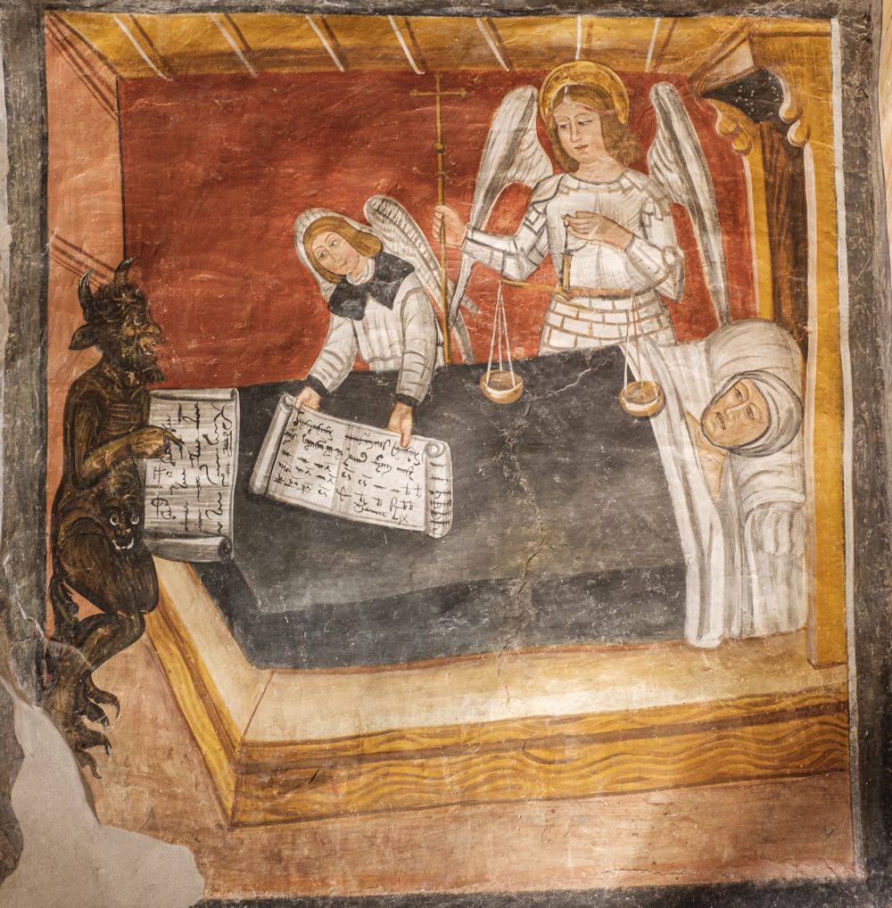 Las pinturas a fresc de la Chapèla Vielha son òbra del 1514 de Giovanni Botoneri de Querasc. Dapè de l’uis d’intrada Botoneri pinta l’originala gerarquia de Sants de la mitica Legion Tebea: Ponç, Constanç, Maurìtz, Manh, Chafrè, Dalmàs e Pancraci, premièrs evangelizators des valadas. A drecha de l’uis se tròbon lhi Sants Lucia, Apollonia, Marguerita e Martin de Tors.