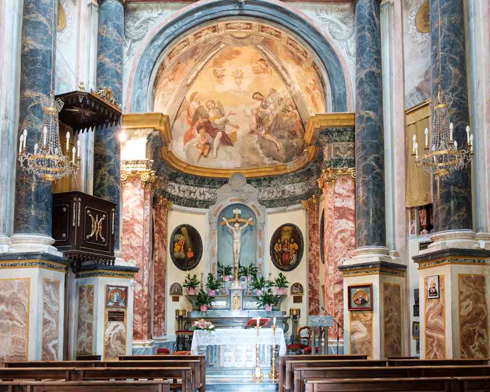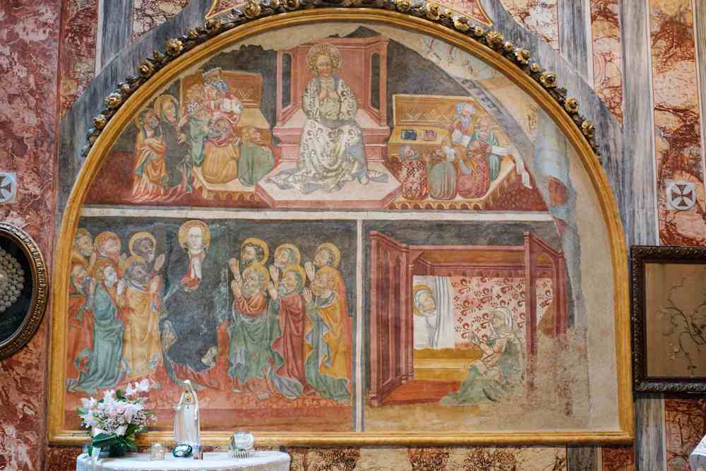 Lo Santuari decorat en marmos colorats a englobat en la chapèla de manchina l’antica estructura medievala, qu’a gardat un preciós cicle de frescs d’autor anònim, del 1410, abo las istòrias d’la Vita de Maria.