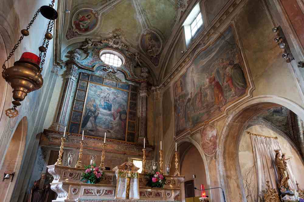 L’absida a drecha a gardat l’originaria vòuta a crotzièra frescaa abo lo Tetramòrf, lhi simbols di quatre evangelistas (Marc e lo leon, Matè e l’angel, Joan e l’aigulha e Luca abo lo tòr); l’òbra da la man decisa e lhi colors fòrts es estaa atribuïa a Hans Clemer, pintre de cort di Marqués de Saluces entre XV e XVI secle, conoissut coma Magistre d’Elva.