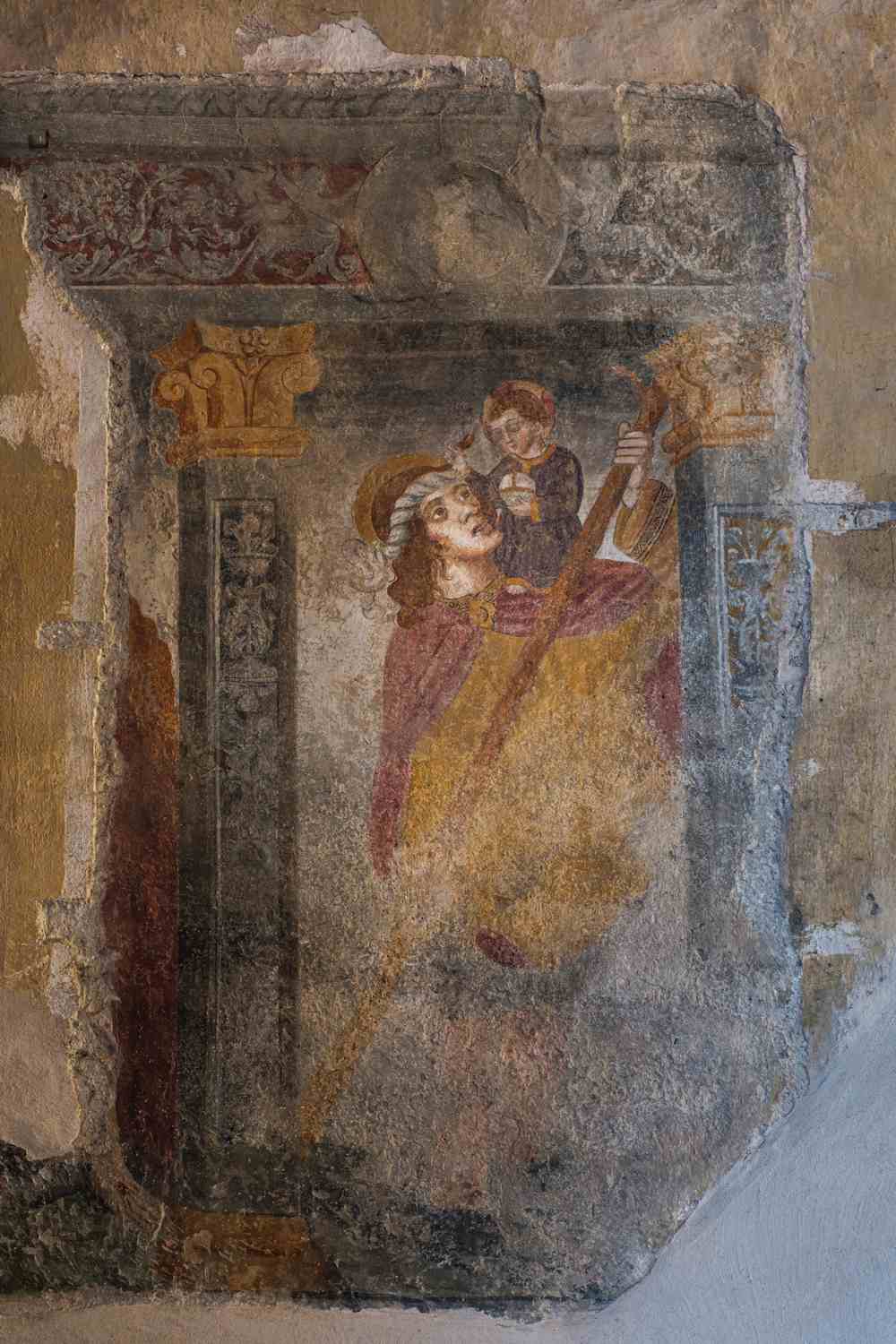En l’absida se tròba decò un fònt baptesimal en marmo blanc, abo lo catin del Sèt Cents e un gamb gòtic, e de chapitèls abo fuelhas e escuds de Savòia. En la navada drecha, es enca’ en part sot chaucina un fresc de la premièra metat del XVI secle abo Sant Cristòfo.