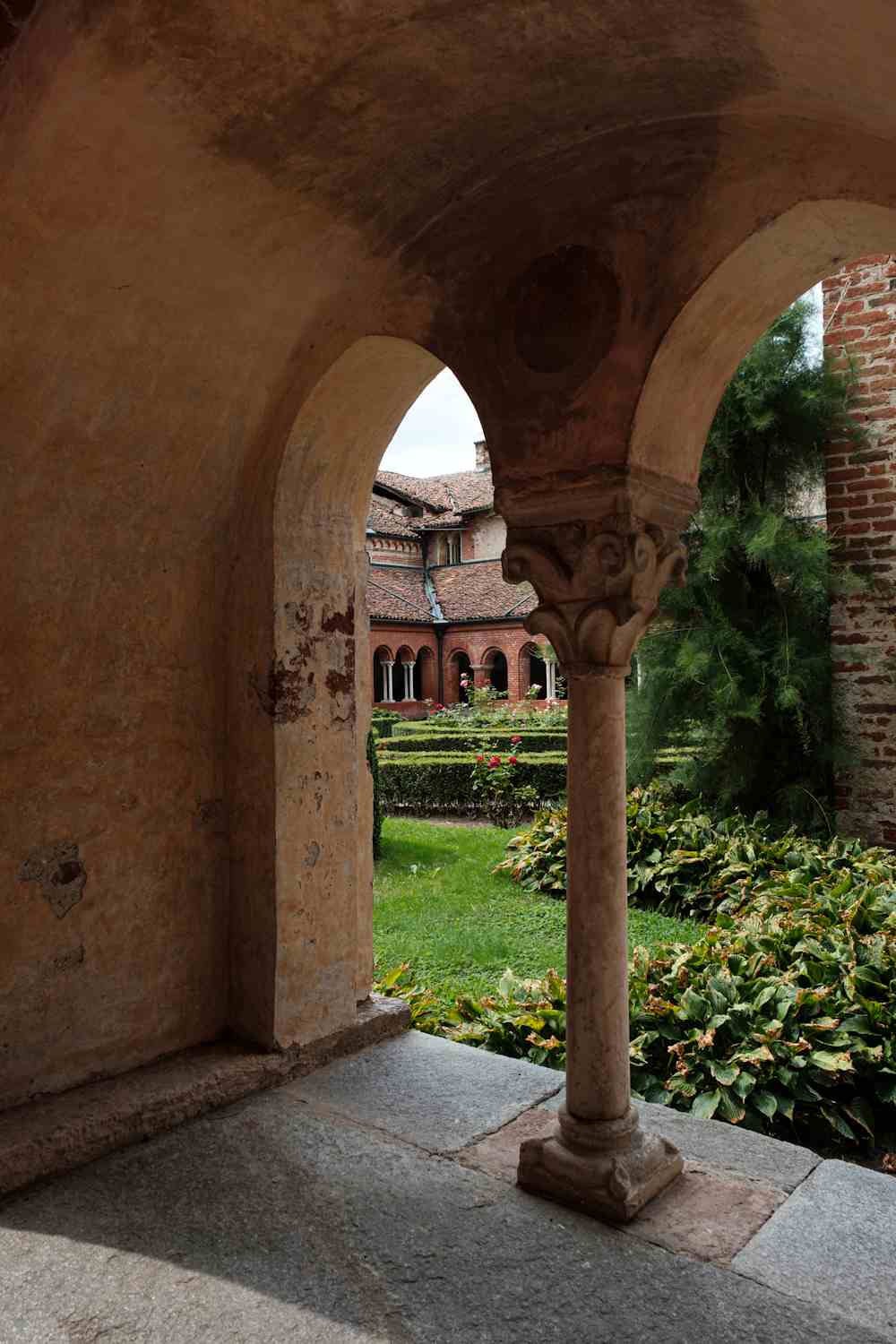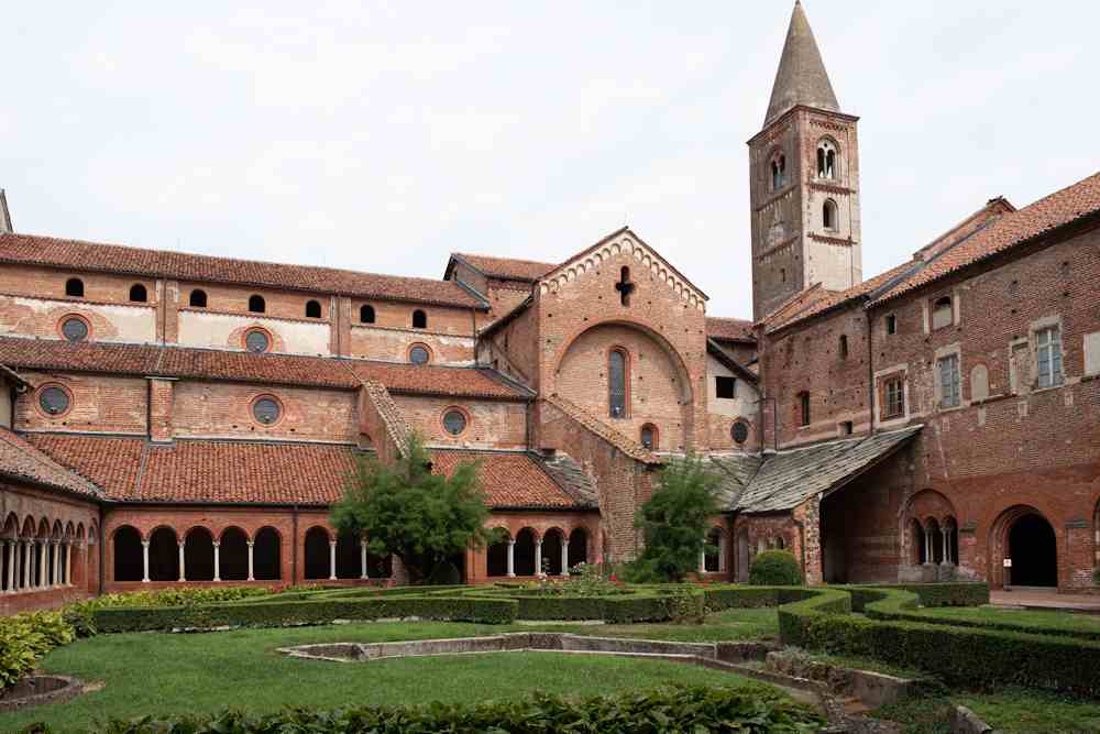 Tres arcs pòrton a l’abadia en mons: al centre se tròba la glèisa romanic-lombarda, da la façada abo nartex a cinq campaas.