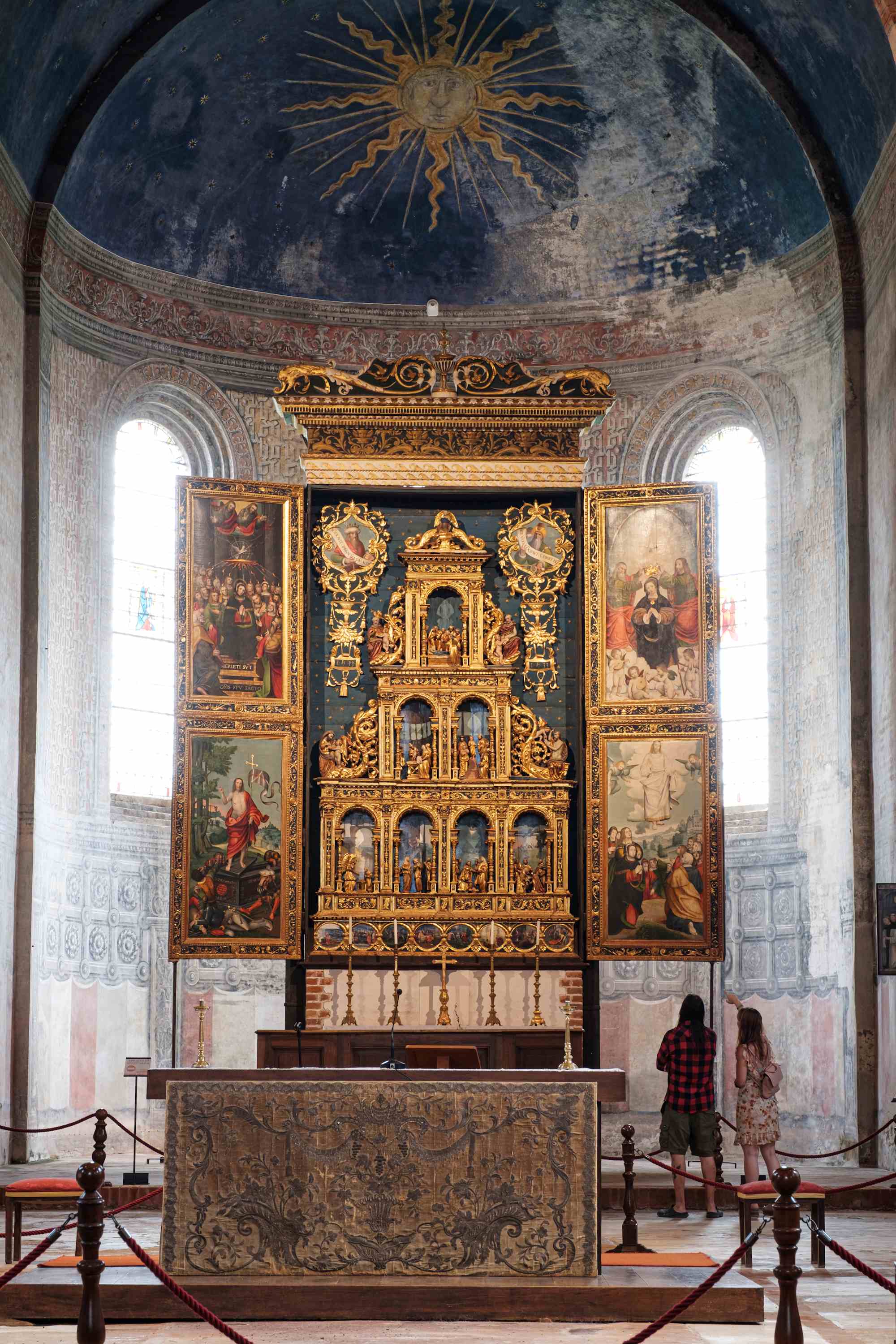 Aperto, presenta las Istòrias de Crist, Pentecòste, Ascension, Resurrecion e encoronacion d’la Vierge, e dessot uech ovals abo las Istòrias de Maria. Preciós decò lo claustre abo colomnas en marmo, lo cloquier gòtic del 1250 a quatre plans, la sacrestia gòtica, la sala capitolara abo vòutas a crotzièra e la foresteria a doas navadas da l’originala façada a monòforas.