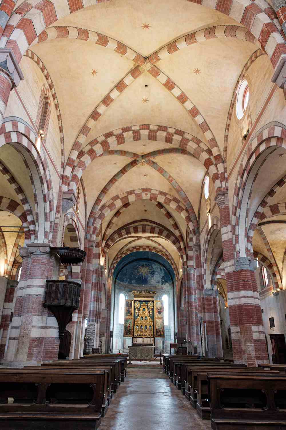 Autra decoracion era donaa da l’alternança di colors, lo blanc e las faissas rossas de mons. Mec ental Cinq Cents venon realizats lhi frescs en façada abo l’Assompta entre Apòstols e Profetas, e en l’absida un solelh sus fons celèst. La glèisa garda un aigasantin en marmo del 1506, un pulpit en estil gòtic borgonhon del 1520 embe esculturas de plantas e bestias, un autar del 1525 de Agostino Nigra e un crocifìs d’escòla francesa abo Maria e Joan del principi del Cinq Cents.