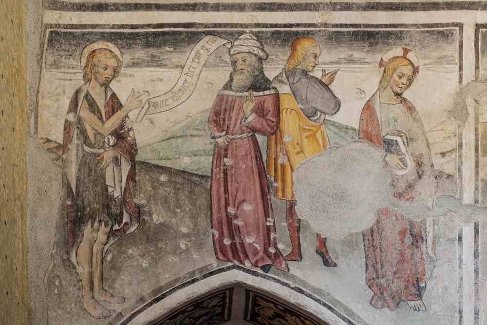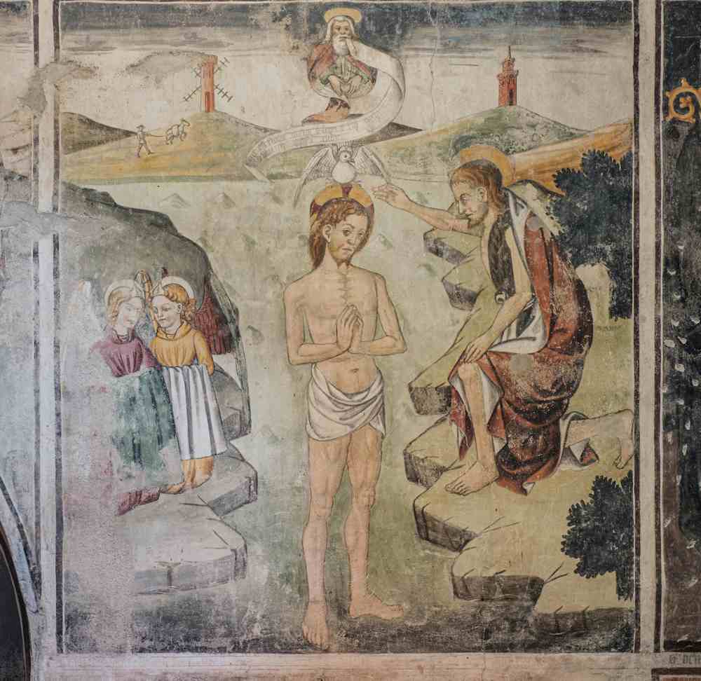 En la premièra chapèla a drecha devion èsser frescaas las Istòrias de Sant Joan Baptista, mas encuei resta mec lo Crist bateat entre angels e lo Paire: sal fons lhi a un lauraire que vai al mulin abo l’ase.