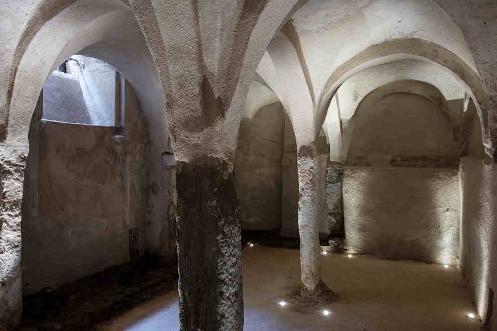 A manchina d’l’intrada se tròbon lhi rests d’la cripta romanica abo decoracions longobardas; en la seconda chapèla a manchina es muraa una antica lastra longobarda de mal leser dicha “inscripcion metrica de Regina”, 28 reas de l’VIII secle.