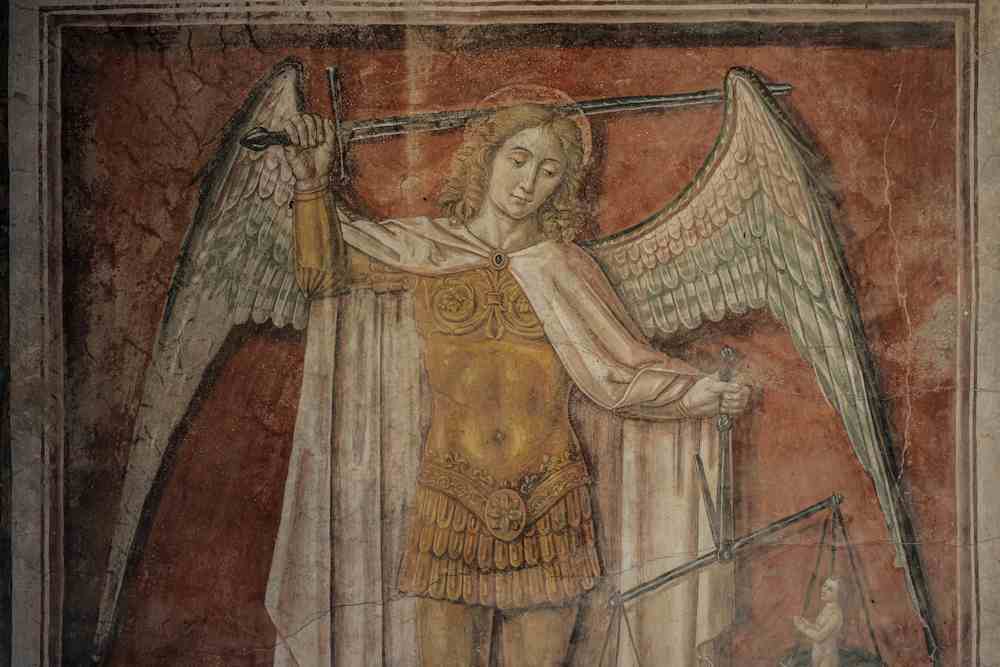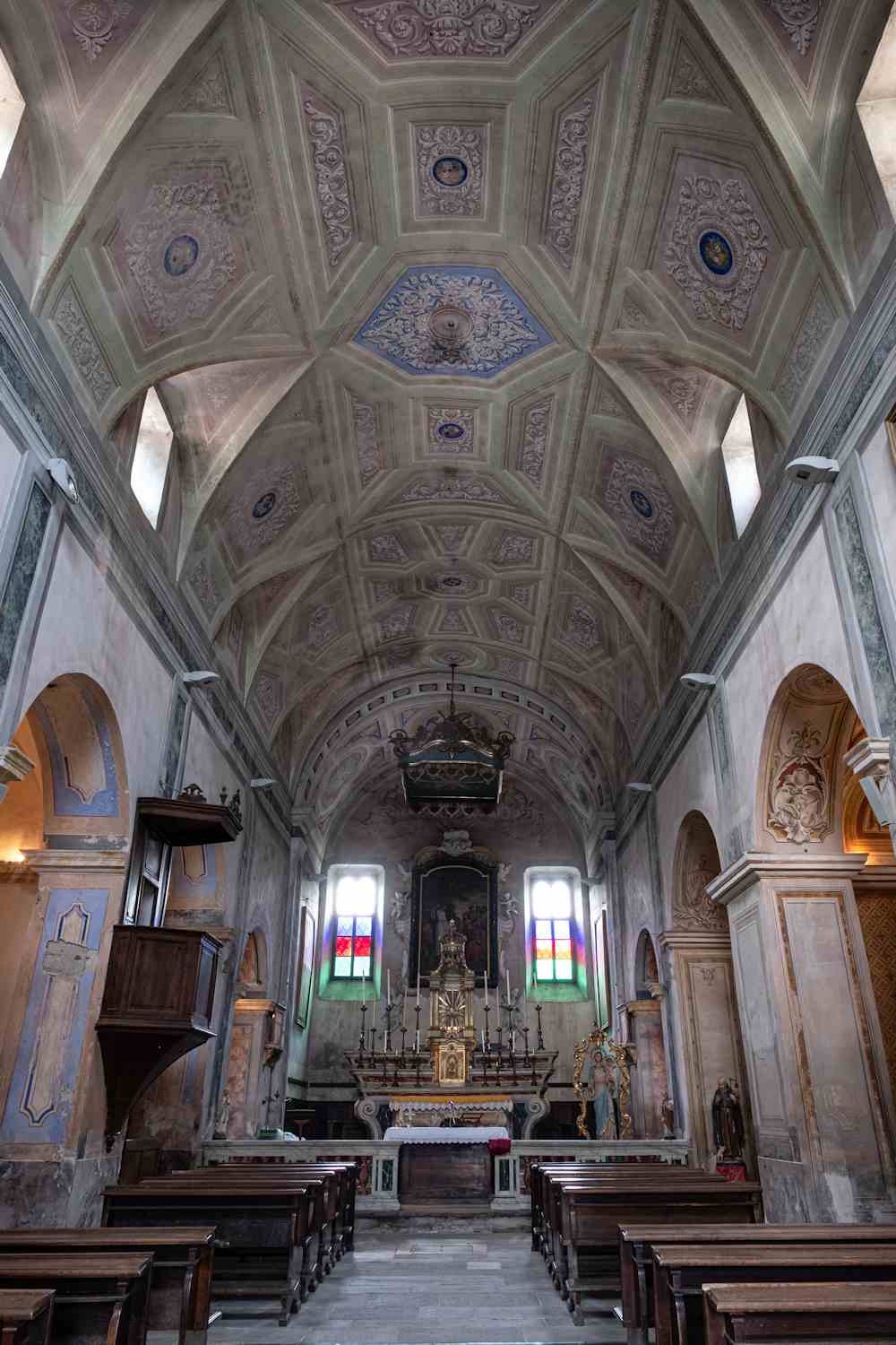 En la seconda chapèla de drecha se tròba lo sarcòfag del Quatre Cents d’l’abat Antonio Pentenati de Verzòl, e l’epigrafa del 1414. La chapèla a gardat decò un fresc de Sant Blas evesco, òbra grossiera del 1467-1477. Sot lo cloquier s’es gardat un preciós fresc de Sant Michel Arcangel, atribuït al pintre flamand Hans Clemer, actiu aicì entre 1495 e 1500; la figura es deventaa simbol des glèisas del circuït Mistà.