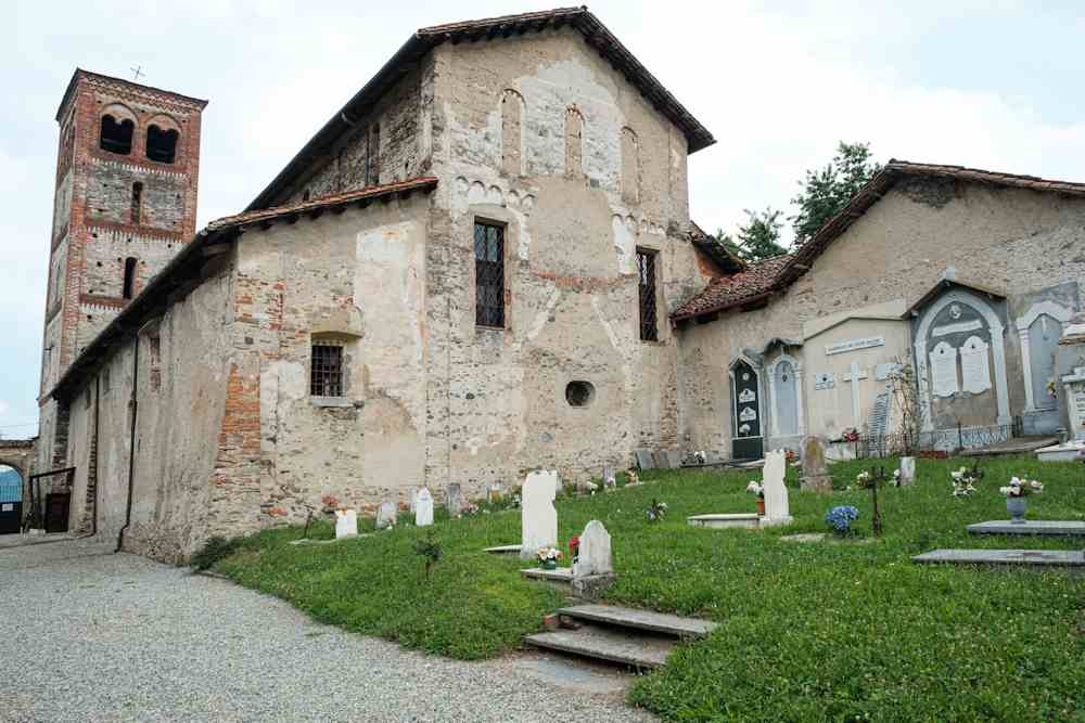 La modèrna façada a est es plaçaa sus l’absida romanica, destrucha ental Sèt Cents: per ajuar a comprener la complicaa evolucion d’la glèisa, lhi rests des fondacions son estats laissats a vista sal sagrat. Lo cloquier del Tres Cents es en estil gòtic lombard abo monòforas, biforas e arquets en terra cuecha. Dedins, la glèisa presenta una solèta navada e de chapèlas del Sieis Cents, abo 12 pilias en mons. Ental Sieis Cents ven realizaa la vòuta, que malurosament sarra sot lo cubèrt de rars frescs romanics del 1100, coma las decoracions de l’antic arc trionfal abo un angel e una frema.