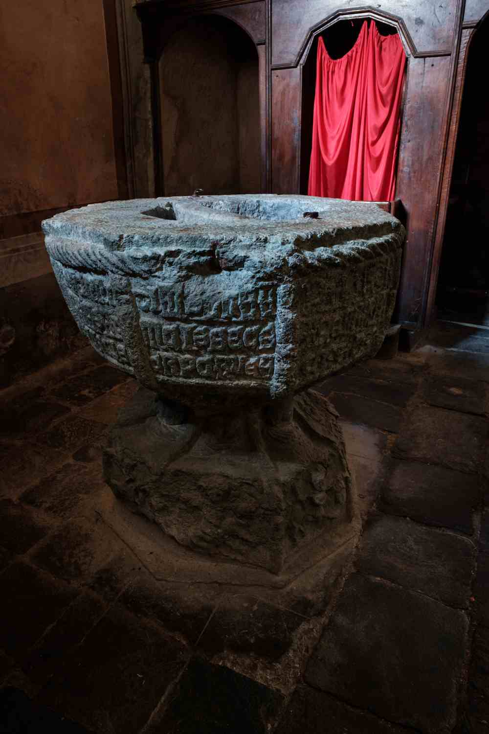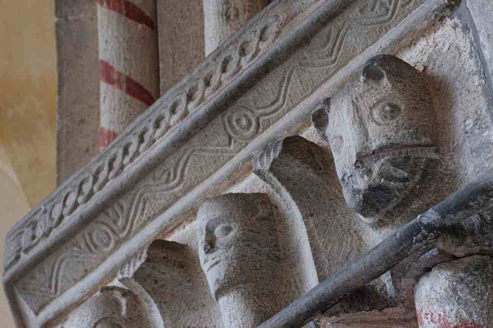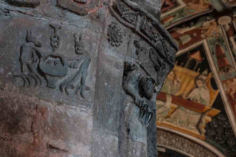 Lhi mesmes motius allegòrics medievals son presents dedins, esculturats sus l’arc en pèira verda qu’arionda lo presbitèri e sus lo fònt baptesimal dal Tres Cents entè es istoriaa la teoria di vicis e des virtuts e vers de Pater Noster, Ave e Credo.