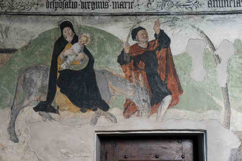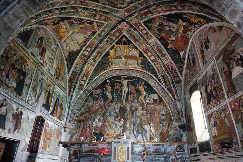 Lo presbiteri es totalament decorat da pinturas a fresc dal flamand Hans Clemer, que remonton a lhi ans entre Quatre e Cinq Cents. Sus lo mur de fons la Crocefission, dinamica e complicaa, es caracterizaa da un fòrt sens dramàtic.