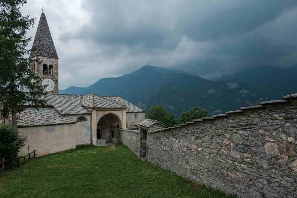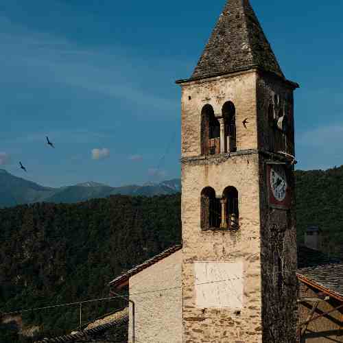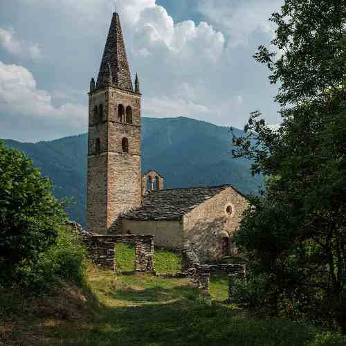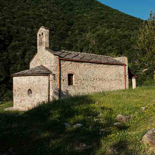 Fondaa dins lo XIII sècle, a la premièra construcion romanica a la fin del Quatre Cents s’ajonton lo presbitèri da la vòuta a crosièra e lo cloquièr gòtic da l’auta cúspida e biforas. Ven retruchaa encara a la fin del XVII sècle, quora la navada centrala es eslonjaa e ven realizaa la Chapèla de San Pancraci, dataa 1762.