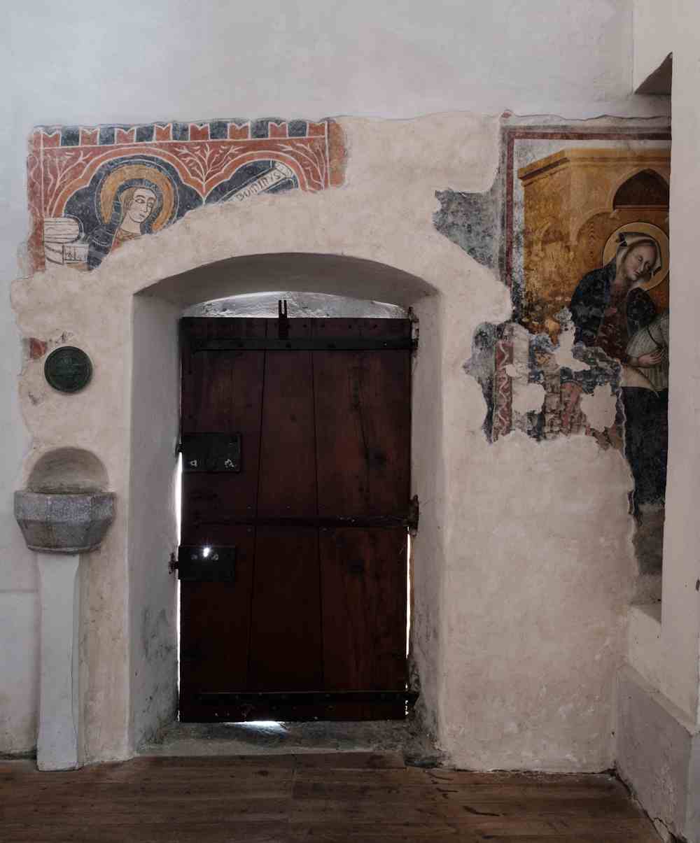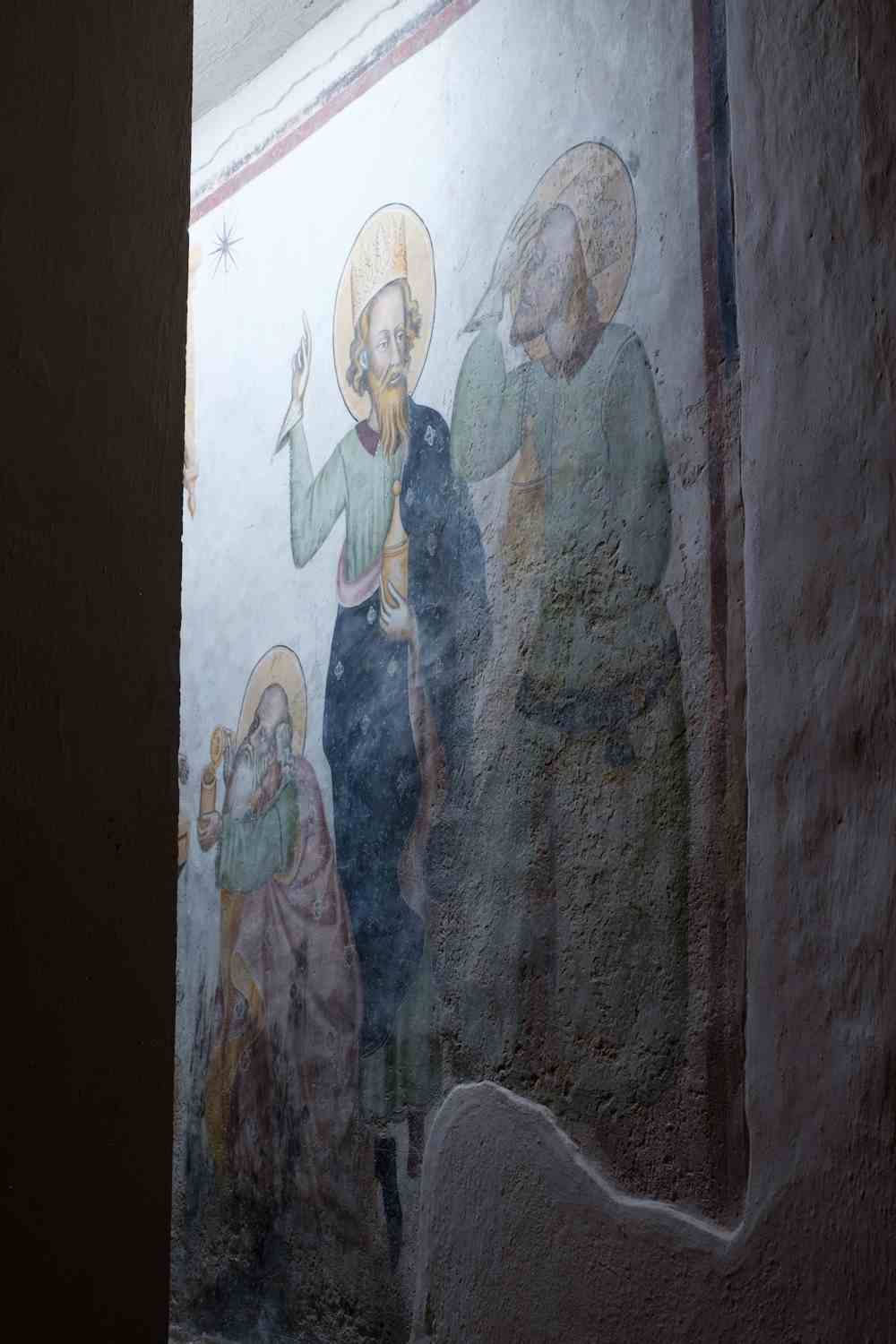 Aquì se retròbon dui cicles d’artistas de periods difèrents, coma dins la granda figura de Sant Cristòfo, gigant que pòrta Jesùs Pichòt, entè la pintura a fresc del tard Quatre Cents es sobrepausaa a n’aquela del Tres Cents.