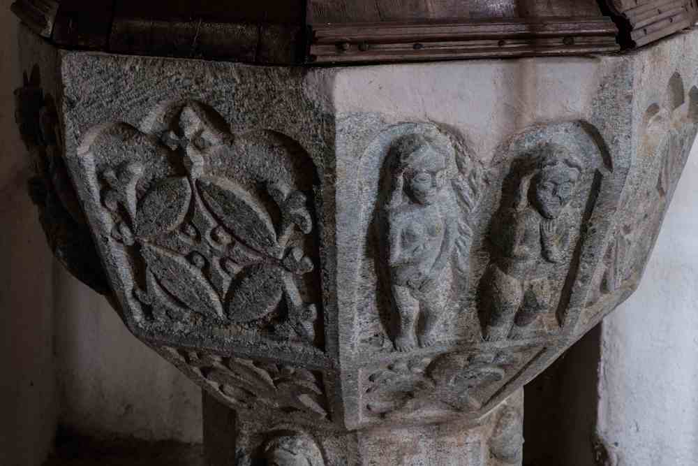 Lo fònt baptesimal tard romanic remonta al principi del XV sècle; bèla si de mal leser, consideraa la collocacion, sus lhi bòrds son esculturats motius geometrics, fuelhas e figuras umanas coma Adam e Eva, la Madòna embè lo Pichòt e angels, la Crocefission e lhi Evangelistas.