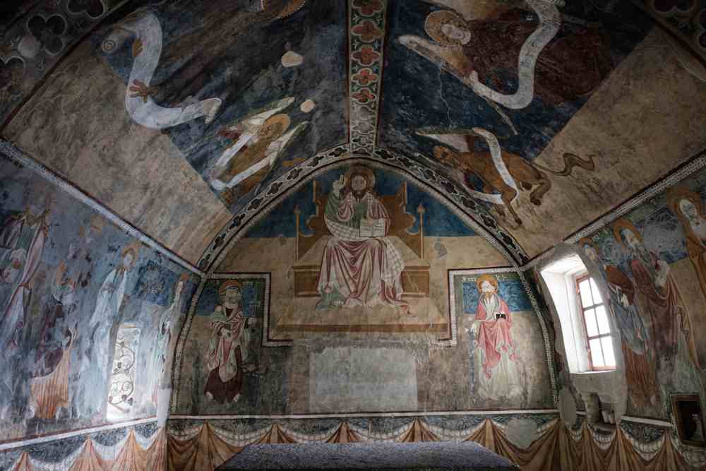 Una granda figura de Criste, entre lhi dedicataris de la glèisa Pèire e Paul embè las claus, lo sabre e lhi libres des letras, dòmina l’absida granda, entè las muralhas son decoraas embè lhi Apòstols: sus la vòuta son rapresentats lhi simbols apocaliptics de lhi Evangelistas. Lo mesme magistre anònim del XIV sècle realiza l’Anonciacion sus l’arc e la figura de Sant Cristòfo que pòrta lo pichòt sus la chapèla del cloquièr. Aquì trabalha decò un second frescant, que realiza en lo tard Cinq Cents la Madòna entre Sant Pèire e Sant’Antòni Abat.