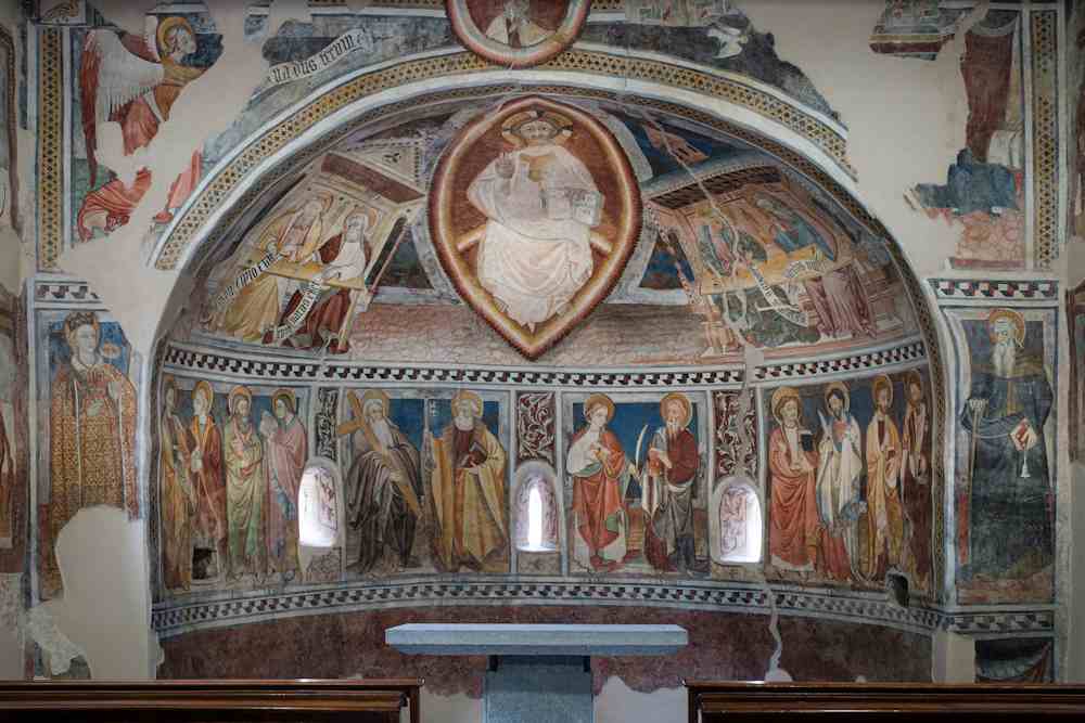 Sus l’arc pareis l’Anonciacion, e sus lhi pè-drechs Santa Catarina embè la roa e Sant Antòni dal baston a forma de tau. Dins la calòta, a l’entorn dal Criste dins l’amètla, venon pintats lhi Evangelistas en chamin a escriure lors Evangelis. Lhi Apòstols son plaçats dins lo catin de l’absida, en quatre sectors, chasqued’un embè lo simbol de son martiri e lo nom escrich en caractèrs gòtics.
