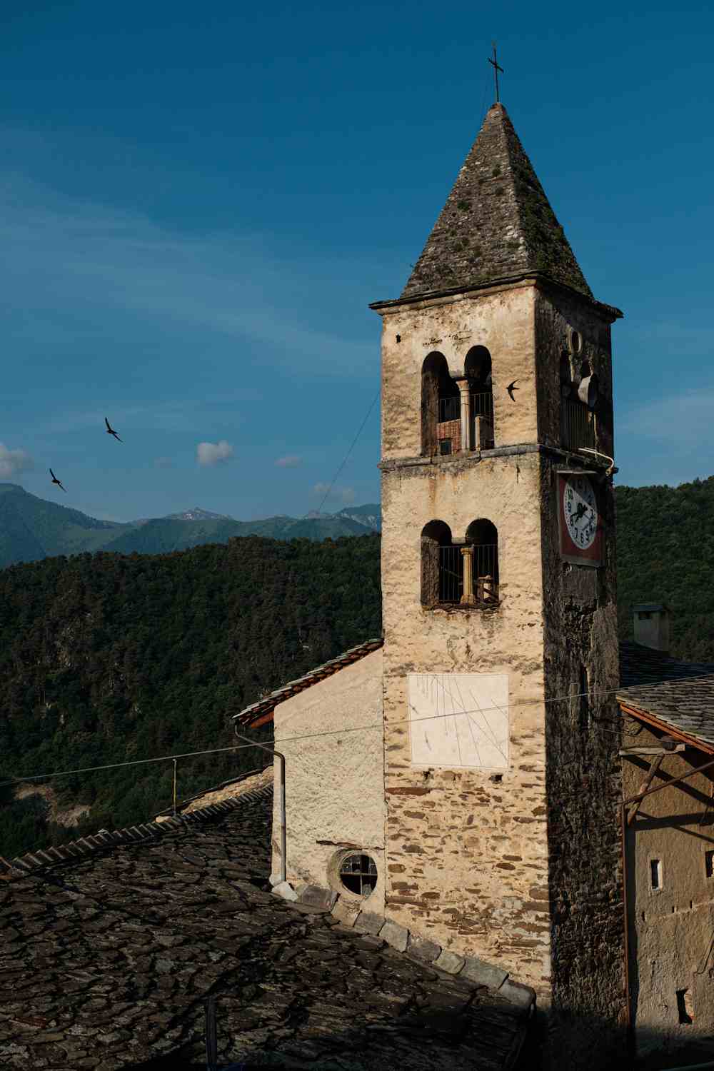 La primitiva glèisa ven bastia en estil romanic, coma es visibile dal cloquièr decorat da biforas, retruchat mai qu’un bòt; mas al temp de la Controreforma l’originala façada romanica laissa lo pòst a una en estil baròc. A la meitat de l’Uech Cents ven bastia la glèisa nòva, dediaa a Sant Joan Baptista e estachaa a la premièra, creant una sobrepausicion rara d’edificis e estils. Lo transet a tres vòutas a crosièra romanica embè costolons arionds en pèira esculturaa embè lo trigrama IHS (Jesùs) es la part mai vielha de la glèisa. Aprés ven jontaa la navada centrala embè vòuta a botala e, ental XVII sècle, la navada laterala. Lhi estucs e las pinturas baròcas an modifiat l’equilibri romanic.