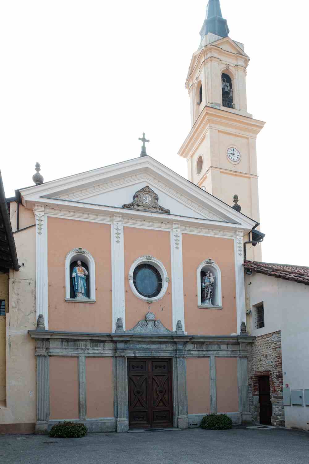 En de fòra la parroquiala presenta una façada abo un timpan e doas estatuas ai cants del pichòt roson central, e un cloquier del Set Cents. dedins, a manchina del portal, es estat da gaire retrobat un fresc del tard Quatre Cents abo la Madòna del Lach. Lo complèx presenta enca’ una part des anticas muralhas ente reston de frescs e un portal a arc aigut tamponat.