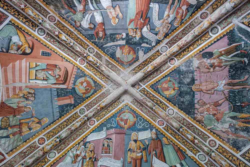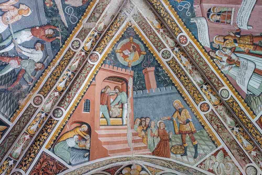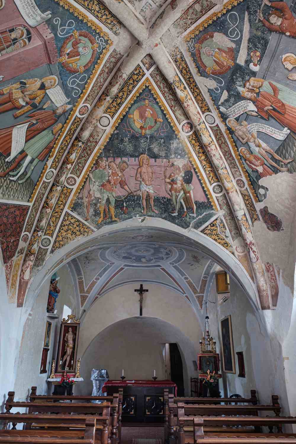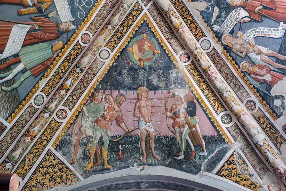Ental 1494 lhi fraires Biazaci o Biasacci de Busca realizon la decoracion des velas de cubertura del pòrtic abo las istòrias d’la vita de Sant Bastian, tiraas da la Legenda Aurea de Jacopo da Varagine; coma per la vesina chapèla de Sant Esteve, las scenas an de bandas escrichas en latin mesclat a la parlaa del pòst.