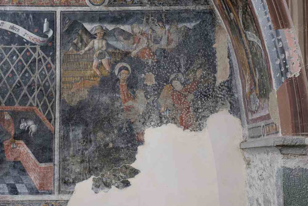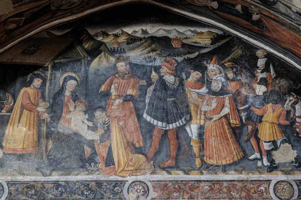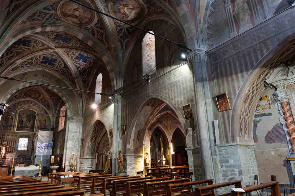 La parròquiala presenta dins las arcadas bòrnhas un extraordinari cicle de pinturas di fraires Biasacci de Busca que remonta al 1460, dediat a las istòrias de la vita de Nòstre Senhor: la decoracion es presentaa sus tres registres. Dins aquel sobeiran tròba espaci l’Adoracion di Tres Reis, seguia dal Massacre de lhi Innocents, denant Eròd en tròn.