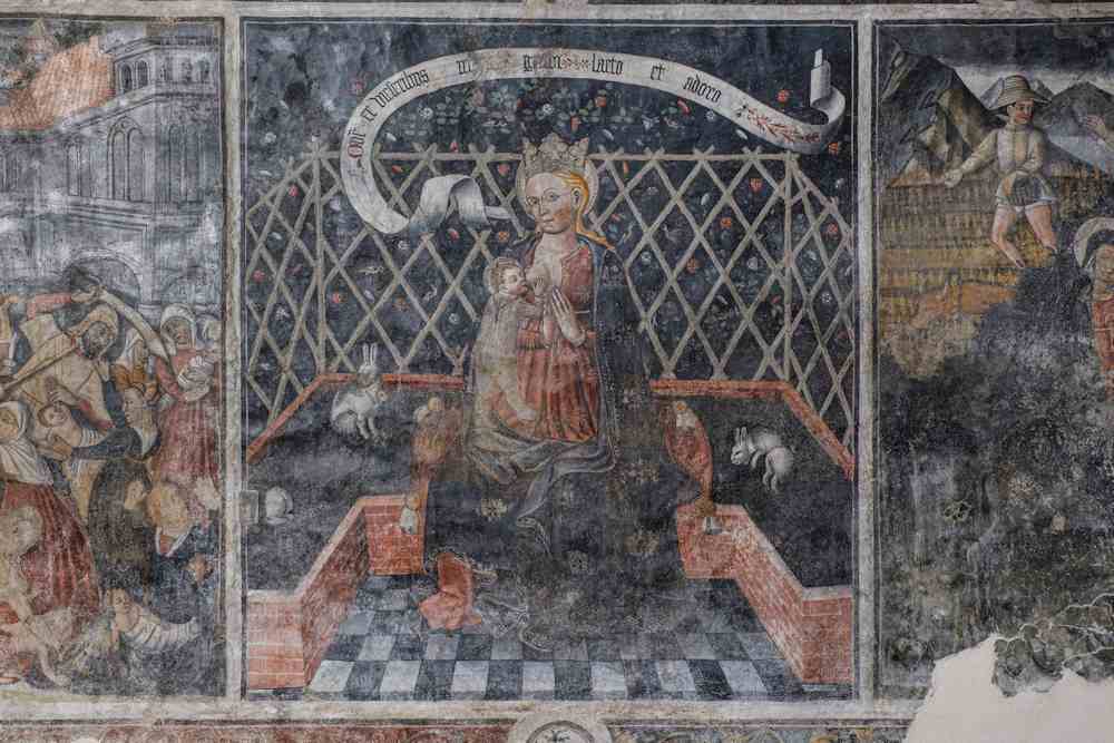 Al centre de l'arc pareis una Vierge dins l'iconografia de l’Hortus conclusus, setaa sus un pichòt tròn en bòsc entre flors e lapins, simbol de vita e feconditat. Las istòrias de Jesùs continuon embè l'Escapada en Egipte, embè la rara scena del miracol del gran, tiraa da lhi Evangelis Apòcrifs.