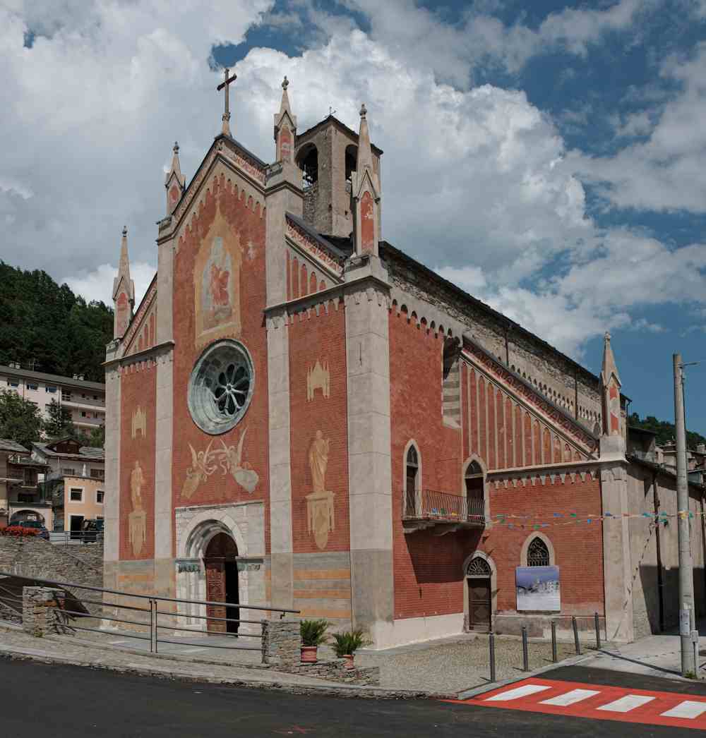 La granda glèisa d’estructura romanica-gotica, presenta jà dins documents del 1386, ven mai bastia a l'entorn dal 1462: la façada garda la rosassa e lo portal en pèira esculturaa, un di mai grandiós portals romanics dal salucés. En pèira verda, es decorat embè motius florats, antropomòrfs, tèstas d'òmes e de bèstias; un portal lateral romanic-gòtic que se duèrb sus la vesina Via Roma pòrta sus l'arquitrau la data 1462.