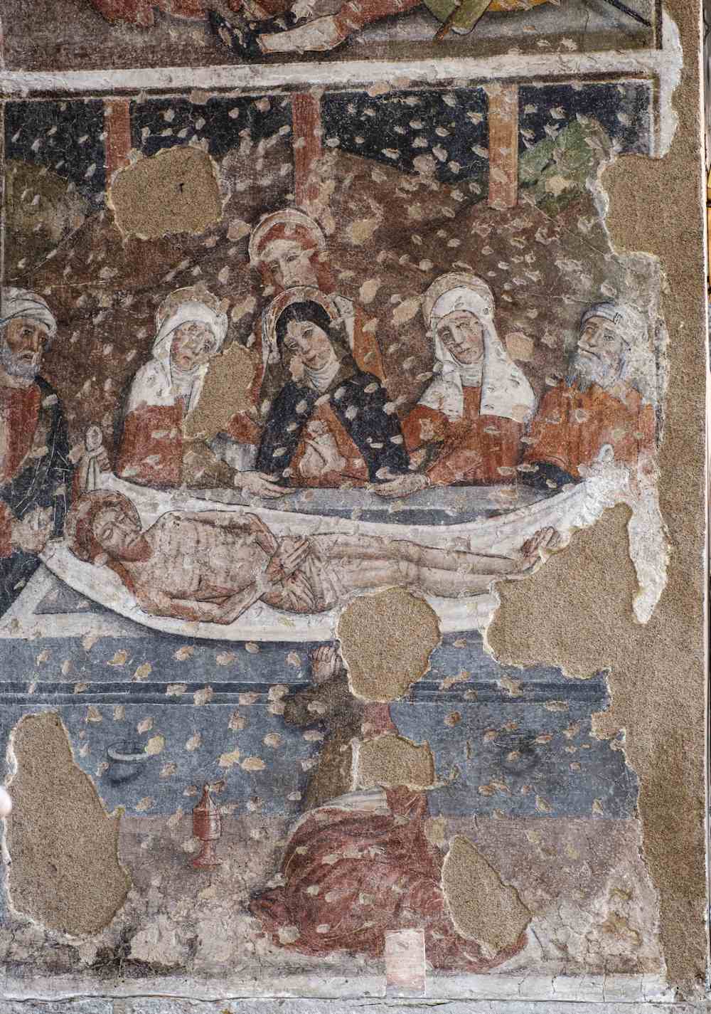 Lo lauraire, estonat perquè a just finit de semenar, obedìs, e per miracol lo gran creis e es prest per èsser meissonat. Ai soldats que demandon quora es passaa la familha, lo lauraire respond lo ver: son passats lo jorn qu'a semenaa. Segurs d'èsser tròp en retard, lhi soldats d'Eròd se retiron. Sot l'arc de drecha son presents d’autres frescs abo lhi sants Catarina, un soldat, Pàire e Paul, Lucia, Bernardin da Siena e un Evesco. Dins lo premier arc de manchina es gardat un fragment d’una rapresentacion de la Crocefission embè un Arcangel Michel que ganha sus un drac, òbra del XVI sècle. Dins lo second continuon las istòrias de Jesùs embè Crocefission e Deposicion. La glèisa garda un fònt baptesimal en marbre blanc octagonal que remonta al 1482 de la botega di fraires Zabreri de Palhièr en Val Maira.