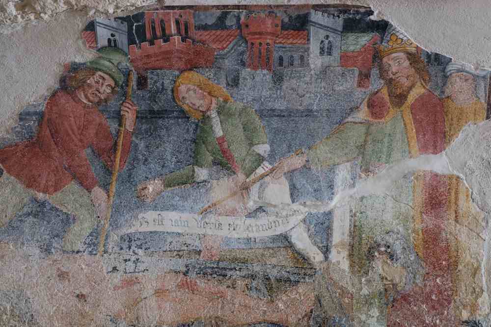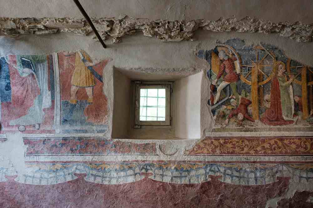 La part pus antica d’l’edifici garda un fresc datat 1474 di fraires Biazaci o Biasacci da joves, coma di l’escricha “Thomas e Matheus frescaverunt”. Lo pichòt local a vòuta a botala es estat enti sècles cubèrt a chaucina e se son perduas las escenas abo las istòrias de Santa Catalina d’Alessandria. Se pòl enca’ veire, a manchina, un soldat virat d’eschina sal lindal d’una pòrta, mentre Santa Catalina es en chamin a èsser martirizaa.