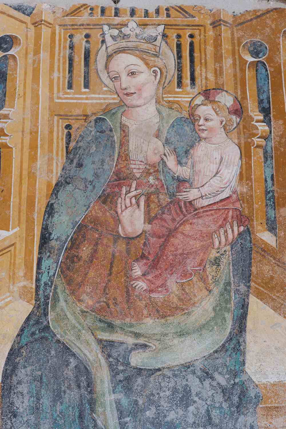 L’edifici es format da dui còrps: dòmina la chapèla una Madòna abo lo Bambin en tròn, abo la testa plegaa a drecha, que presenta grands uelhs e nas drech, caracteristics di Biazaci. La Vierge a de mans gròssas e toponuas, vesta rossa estrecha en vita abo mantel celest, e una granda aureola orlaa de blanc.