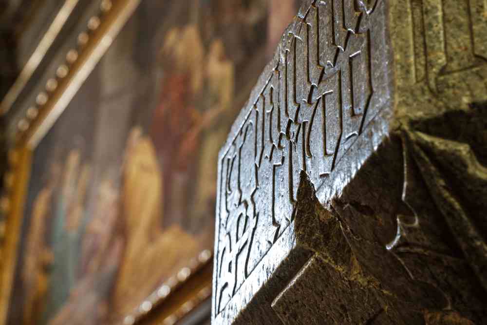 Dedins, l’edifici a una navada solèta embè pichòtas chapèlas garda un fònt baptesimal gòtic octagonal embè escrichas tiraas dal Credo e da l’Ave e la data 1450, exemplar entre lhi mai recerchats de la botega di esculturs Zabreri de Palhièr en Val Maira.