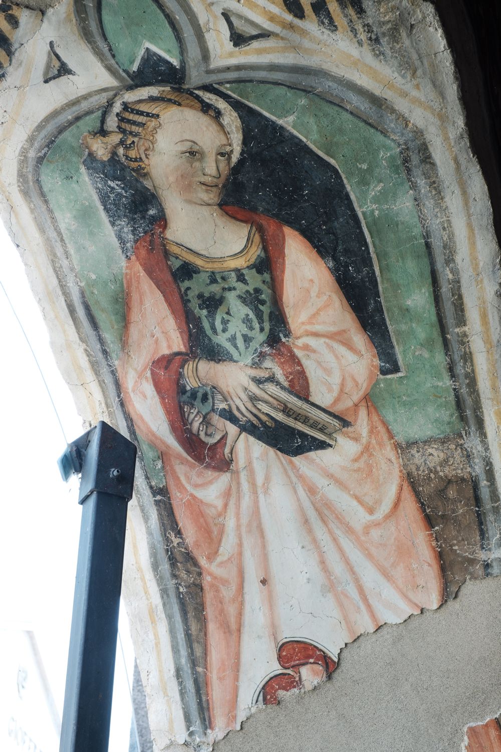 L’istòria remonta al temp de Dioclecian, mas las scenas son ambientaas en una vila medievala abo tors e merles, e las vestas di protagonistas son renaissimentalas. Sus l’arc de fòra es escricha la data de l’òbra e enti sotarcs se tròbon Santa Barbara abo la tor ente era estaa empresonaa dal paire perque cristiana, Santa Cristina, flagelaa dal paire e martirizaa abo las flechas perquè avia pas venerat las divinitats paganas, Santa Prassede, predicatrìs perseguitaa da l’emperator Antonino Pio, e Santa Cecilia, patrona di musicistas, rapresentaa abo lo libre de musica.