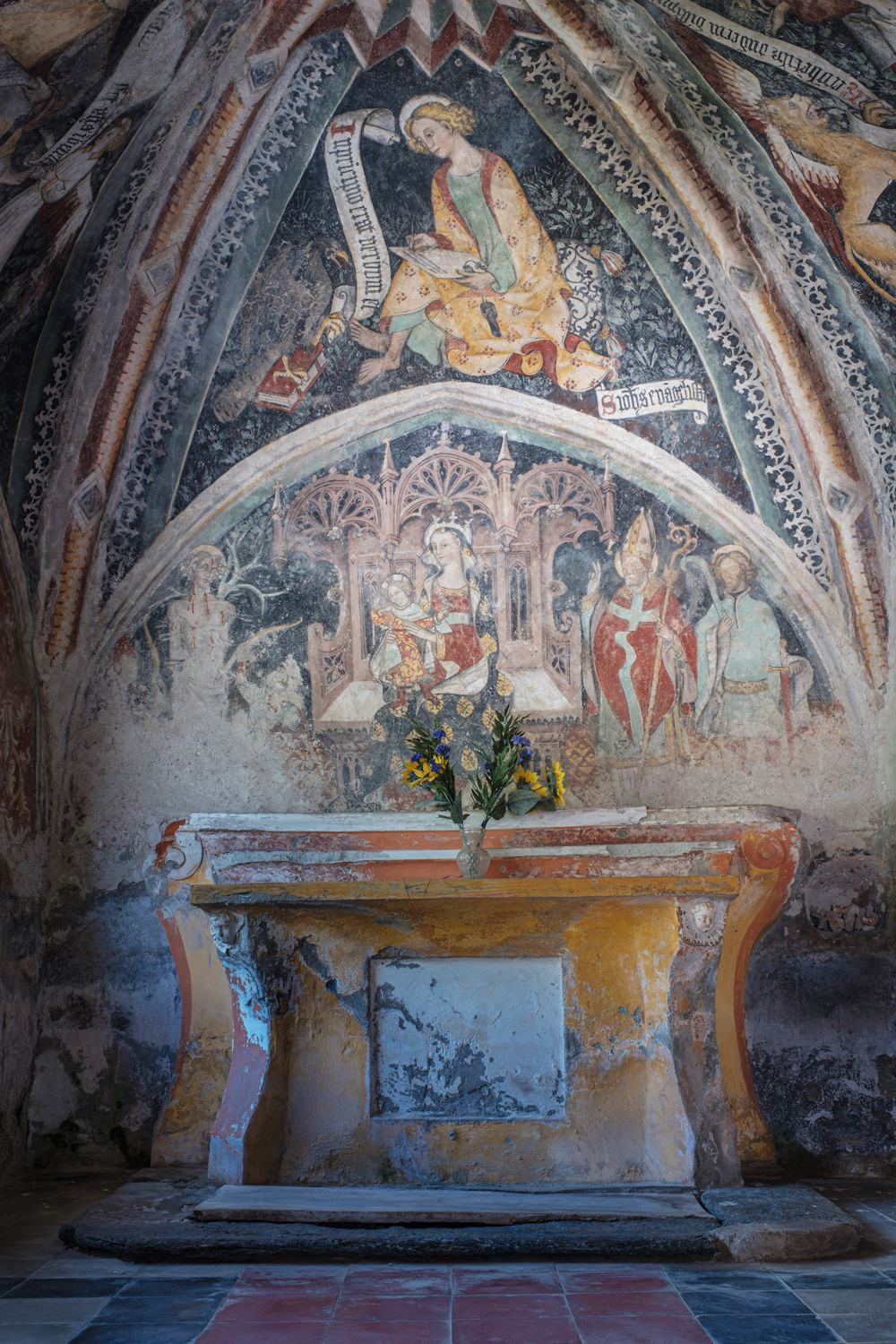 Sal mur de fons es rapresentaa la Madòna embe Jesus, vestia coma una princessa e setaa sus un tròn esculturat e penchenaa a la mòda dal Quatre Cents; Evangelistas e Vierge son un de lhi exemples pus auts del gòtic internacional piemontés. A la manchina d’la Vierge se tròbon Sant Nicolau de Bari e benlèu Sant Constanç; a la drecha es rapresentat Sant Bastian, e a drecha d’la chapèla lo siu martiri.
