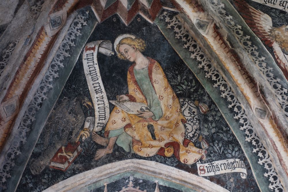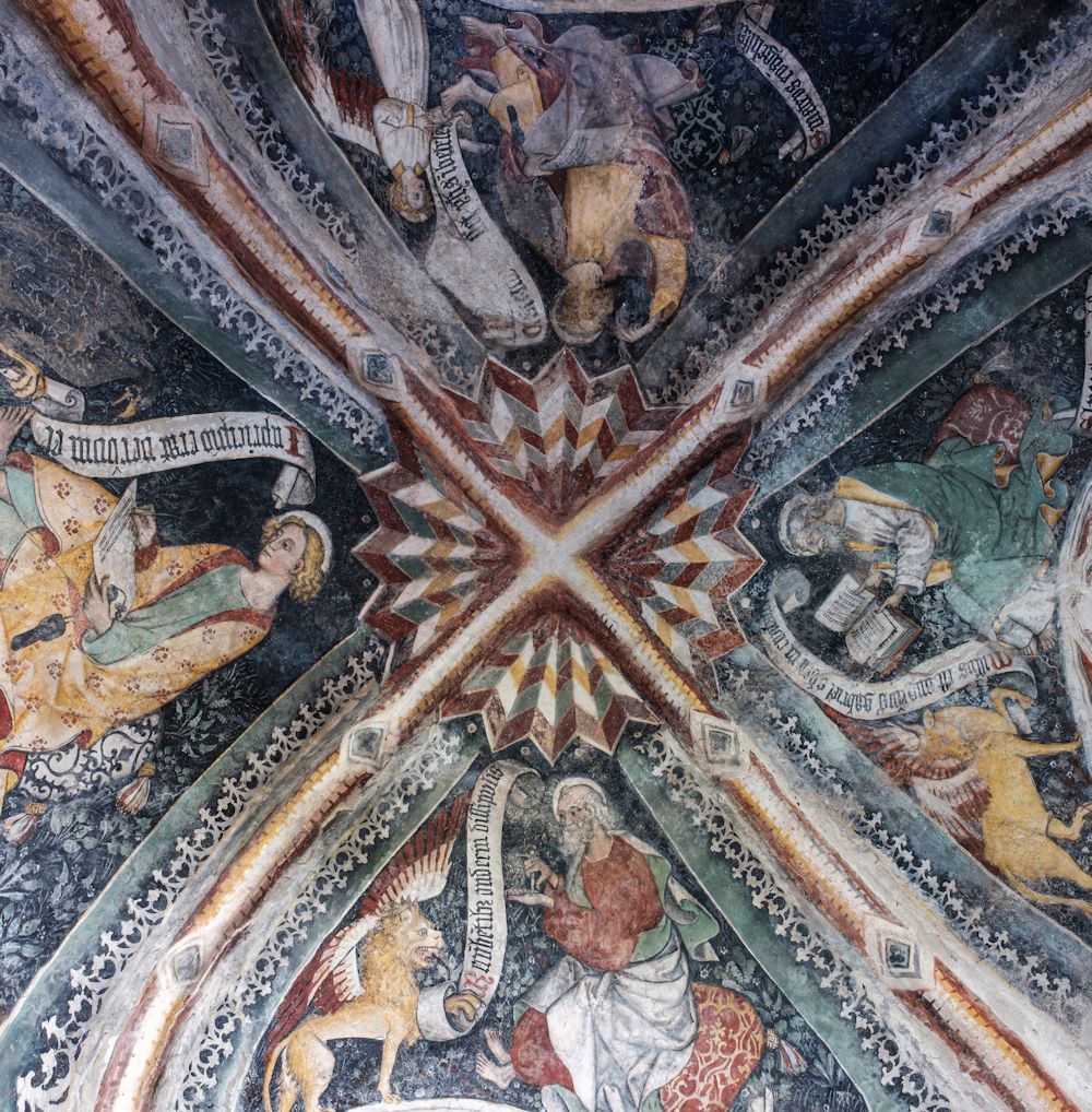 S’la vòuta a crotzièra son rapresentats lhi Evangelistas abo lors símbols apocaliptics: lhi personatges son setats sus de cuissins brodats dins un prat florit en tren d’escriure lors Evangelis.