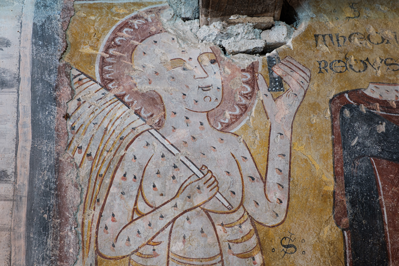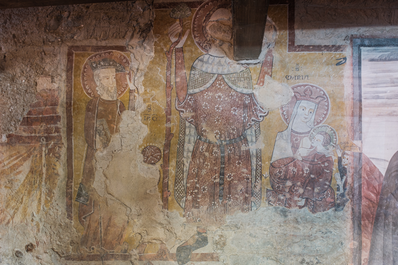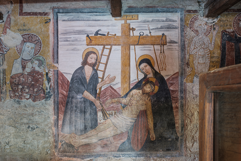 La navada manchina garda un extraordinari exemple de pintura del Tres Cents: una Vierge abo lo Bambin entre monges e Sants. Se reconeisson las figuras de Sant Cristòfo, Sant Jaco, Sant Bartolomèu (Tromè) e Sant Teofredo, separaas dal grop principal da una Deposicion del ‘500 atribuïa a Giovanni Botoneri, dramatica per lo realisme en la reproducion de lhi instruments del martiri e del sang.