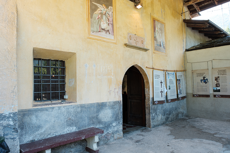 La simpla façada a perdut lo pròtir e l’òcul, e entre XIX e XX secle es estat realizat un pronao: sobre lo portal es muraa una pèira abo crotz astila longobarda e doas testas umanas, benlèu adobraa en foncion apotropaica, que fasia part d’un sarcòfag del VII secle. La chapèla presenta un di gaire cloquiers a vela del territòri.