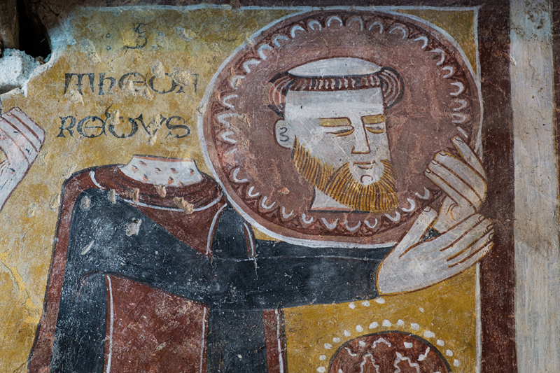 Sant Tromè pòrta a còl sia pèl destachaa, e la testa talhaa de Sant Teofredo navisa lo siu martiri, bèla si la tradiccion agiografica conta que lo Sant sie mòrt per una pèira recebua s’la testa.